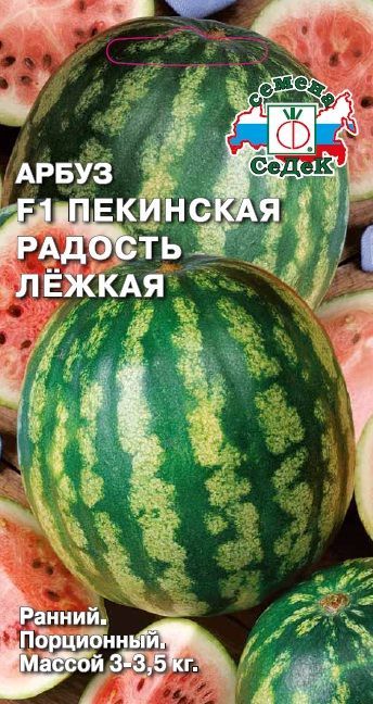 Арбузы серии «Пекинская радость» отличаются непревзойденными вкусовыми и товарными качествами. Раннеспелый (от всходов до созревания плодов 80-90 дней, от завязывания плодов до созревания 20-25 дней) гибрид для открытого и защищенного грунта. Плоды округлые, зелёные, с темными полосами, массой 3-3,5 кг. Кора толстая, плотная. Мякоть красная, зернистая, очень сладкая. Семена мелкие, темные. Урожайность с растения 9-12 кг. Ценность гибрида: устойчивость к заболеваниям, высокие вкусовые качества, отличная урожайность, пригодность к длительному хранению. Назначение универсальное. Оптимальная для прорастания семян температура почвы 20-25?С.