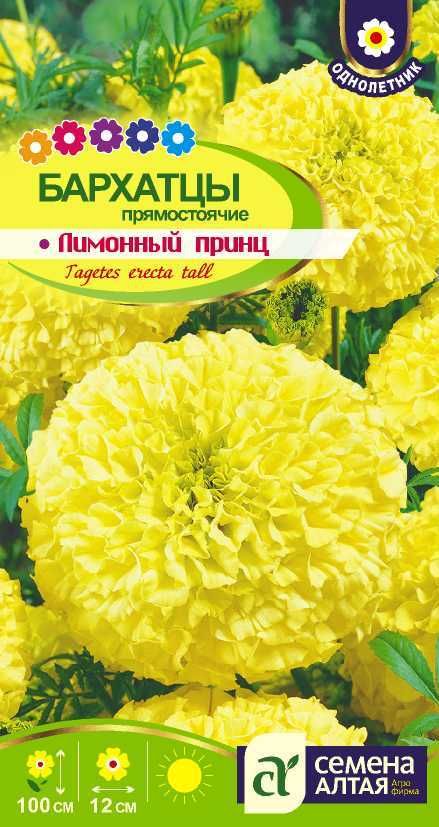 Ветвистый декоративный однолетник с прямостоячими боковыми стеблями. Гигантские густомахровые соцветия, расположенные на длинных и прочных цветоносах, окрашены в роскошный лимонно-желтый цвет. Сорт отлично подходит для оформления заднего плана цветников, высокого бордюра, посадки на клумбы и рабатки. Срезанные цветы длительное время сохраняют свежесть и декоративность. Растение тепло- и светолюбивое, но может расти и в полутени, засухоустойчиво, нетребовательно к почве и влаге. Выращивать можно
