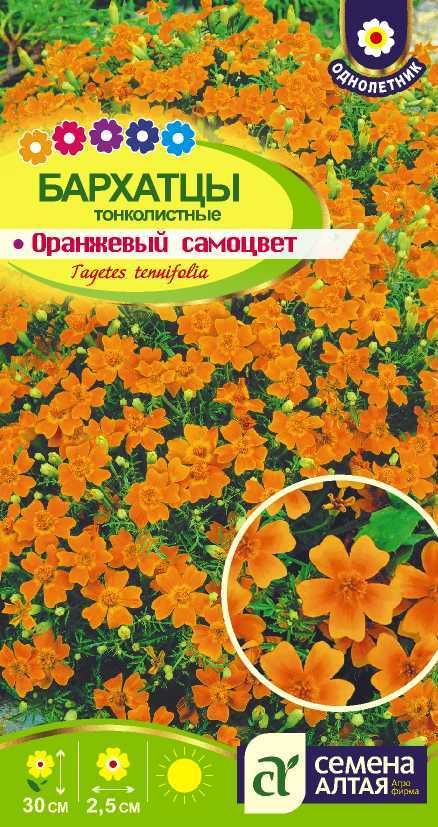 Тонколистные бархатцы образуют невысокие (25-30 см) нарядные кустики правильной куполовидной формы, со множеством тонких побегов и изящными резными светло-зелеными листьями. Из листвы выглядывают многочисленные мелкие, диаметром 2-2,5 см, немахровые оранжевые цветки. Обильно цветут с июня до заморозков. Украсят любую садовую композицию, нарядно смотрятся у подпорных стенок, кулис кустарников, используют для обрамления клумб, бордюров и украшения балконов. Свето- и теплолюбивое растение, не требовательное к почве и поливу. Легко переносит пересадку в цветущем состоянии. Высаживается на рассаду в апреле, высадка рассады в грунт - в июне. Посадочное расстояние – 25 см.
