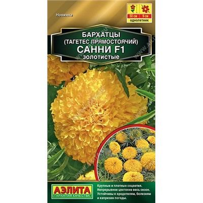 Гибрид с превосходными декоративными качествами. Махровые, по-настоящему крупные цветки достигают 8-9 см в диаметре. Бархатцы Санни F1 отличаются устойчивостью к болезням и вредителям. Растения среднерослые, высота* крепких, прямостоячих побегов до 40-50 см. Боковые стебли обеспечивают компактным кустикам аккуратную форму. Соцветия плотные, после дождя и полива влага не скапливается в основании лепестков. Цветки долго сохраняют яркость, свежесть и опрятный вид.