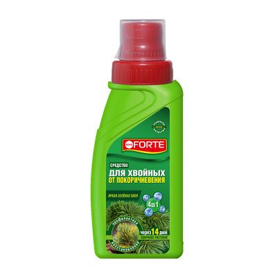 Bona Forte от покоричневения хвои – концентрированное удобрение с микроэлементами и янтарной кислотой. Применяется в качестве внекорневой подкормки для хвойных культур. Препарат обеспечивает яркую и зеленую хвою, предотвращает и снимает хлороз, стимулирует темп развития растения, предотвращает покоричневение хвои, увлажняет и питает корневую систему, поддерживает и укрепляет иммунитет всех типов хвойных растений.