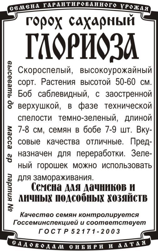 Скороспелый, высокоурожайный сорт. Растения высотой 50-60 см. Боб саблевидный, с заостренной верхушкой, в фазе технической спелости темно - зеленый, длиной 7 - 8 см, семян в бобе 7 - 9 шт. Вкусовые качества отличные. Предназначен для потребления в свежем виде и для переработки. Зеленый горошек можно использовать для замораживания.