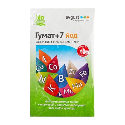 Август Гумат +7 Йод – удобрение на основе гуминовых кислот, содержащее весь необходимый набор микроэлементов. Применяется для обработки посадочного материала и корневой подкормки овощных, ягодных, плодовых, цветочных культур и комнатных растений. Препарат обеспечивает улучшение структуры и плодородия почвы, ускоряет созревание плодов и усиливает плодоношение, развивает корневую систему, уменьшает вредное воздействие солей тяжелых металлов, нитратов.