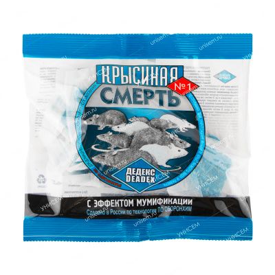 DEADEX Крысиная смерть №1 – родентицидное средство с эффектом мумификации в форме специальных брикетов, окрашенных в яркий цвет. Применяется для истребления всех видов мышей, а также крыс и других грызунов. Приманка содержит горькую добавку «битрекс», предотвращающую случайное съедение приманки человеком или домашними животными (кроме грызунов). Специально подобранные сильные привлекатели гарантируют хорошую поедаемость отравленной приманки грызунами.