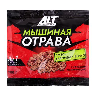 ALT Мышиная отрава – готовая к применению приманка в виде смеси гранул и зерна розового или другого яркого цвета для уничтожения домовых мышей, полевок и других мышевидных грызунов, а также серых и черных крыс. Применяется на объектах различных категорий, включая пищевые, лечебные, детские учреждения (за исключением спален, игровых комнат, столовых). Приманка содержит горькую добавку «битрекс», предотвращающую случайное съедение приманки человеком или домашними животными (кроме грызунов). В качестве действующего вещества используется – бродифакум. Бродифакум – антикоагулянт из группы кумаринов, применяется в качестве родентицида против всех видов грызунов. Действует даже после однократного приема.