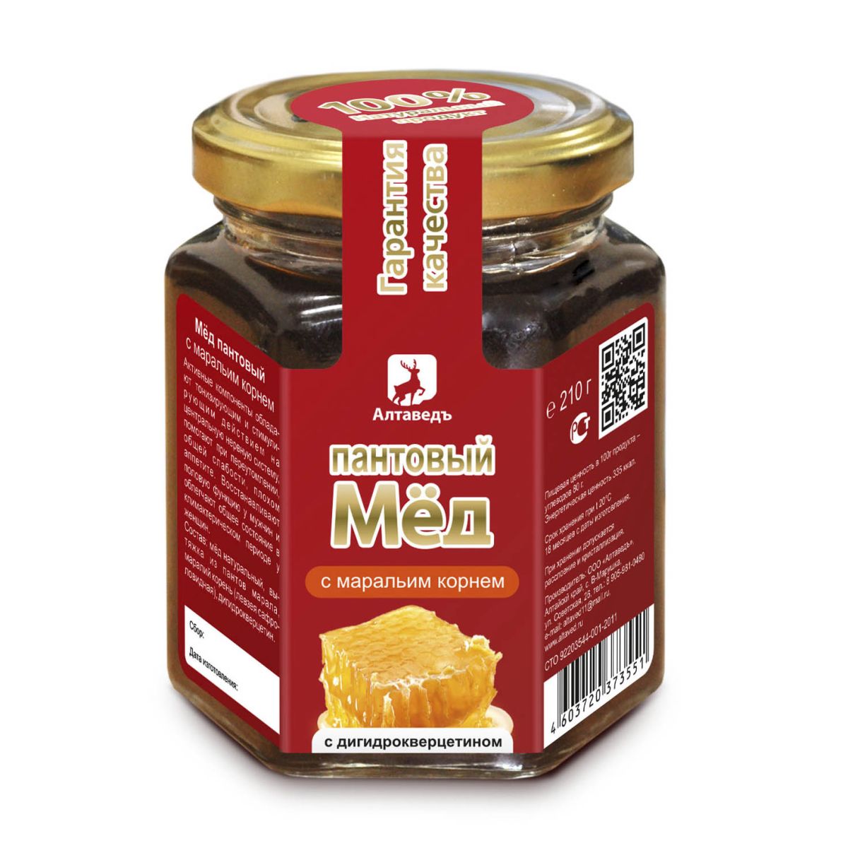 Состав: мёдовая вытяжка пантов марала, красный корень (копеечник забытый), дигидрокверцетин.