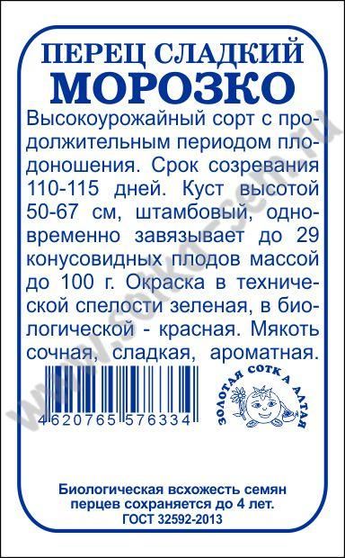 Высокоурожайный сорт сибирской селекции с продолжительным пери- одом плодоношения. От всходов до технической спелости 110-115 дней. Растение высотой 50-67 см, штам- бовое, одновременно завязывает до 29 конусовидных плодов массой до 100 г. Окраска в технической спело- сти зеленая, в биологической - крас- ная. Мякоть сочная, сладкая и аро- матная. Сорт отличается стабильной урожайно- стью и отличной завязываемостью плодов.