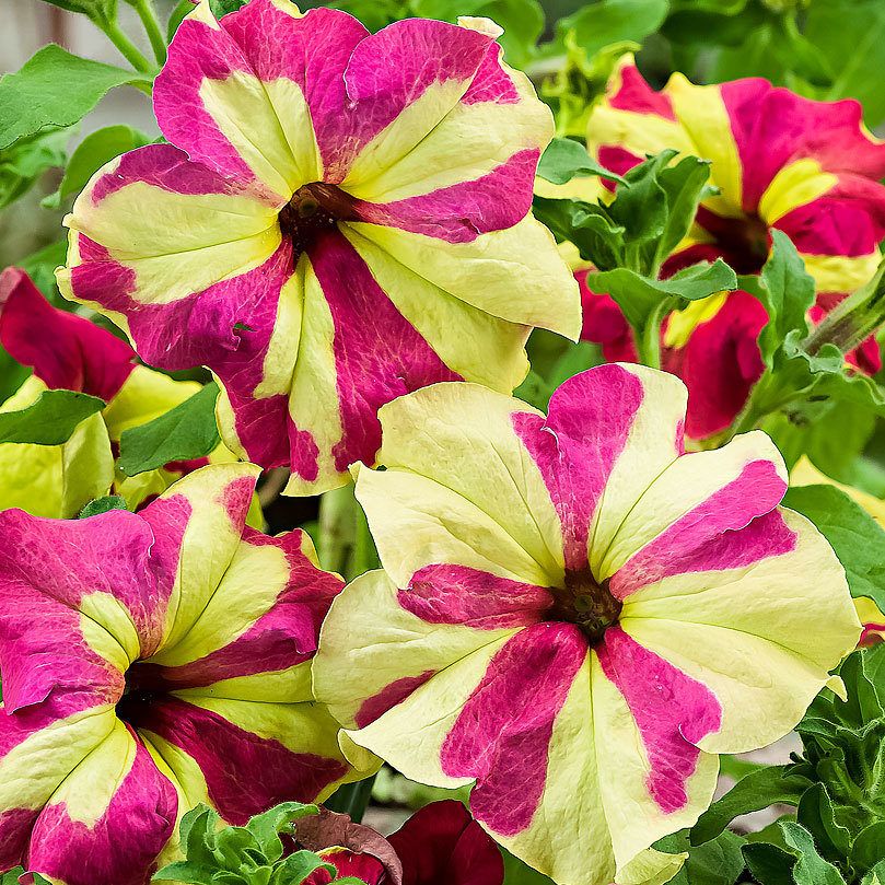 Петуния Софистика F1 Лайм – растение образует аккуратные кустики высотой 20-30 см, усыпанные кораллово-розовыми цветками с желтым горлом диаметром 5-6 см. Из-за неравномерного окрашивания (тона переходят из более насыщенных и плотных в более светлые и легкие) цветки кажутся воздушными, полупрозрачными, будто сияют, пропуская солнечный свет. Эффект усиливает ярко-выраженное жилкование, интенсивность которого меняется от цветка к цветку. Гибриды неприхотливы, обильно цветут и даже в ненастную погоду сохраняют свою привлекательность.