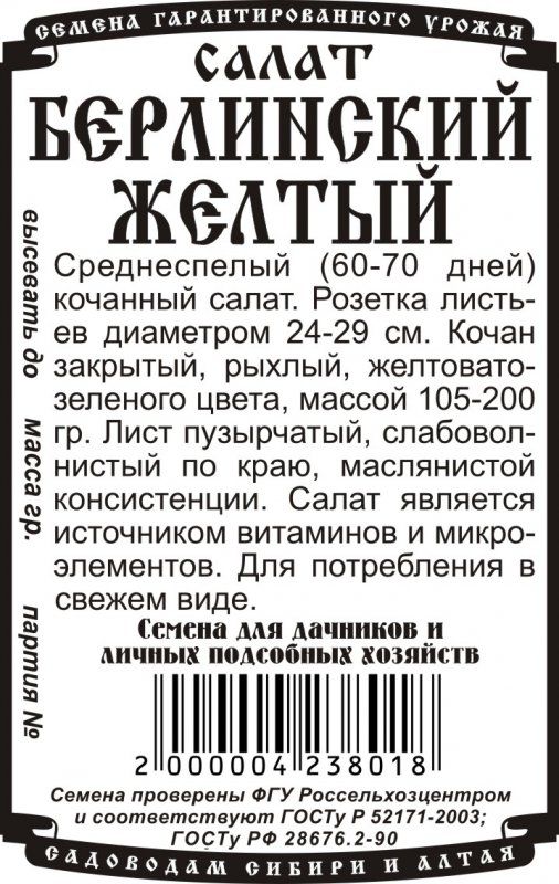Среднеспелый (60-70 дней) кочанный салат. Розетка листьев диаметром 24-29 см. Кочан закрытый, рыхлый, желтовато-зеленого цвета, массой 105-200г. Лист пузырчатый, слабоволнистый по краю, маслянистой консистенции. Является источником витаминов и микроэлементов. Для потребления в свежем виде.