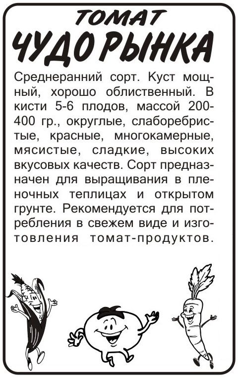 Среднеранний сорт. Куст мощный, хорошо облиственный. В кисти 5-6 плодов массой 200-400 г, округлые, слаборебристые, красные, многокамерные, мясистые, сладкие, высоких вкусовых качеств. Сорт предназначен для выращивания в пленочных теплицах и открытом грунте. Рекомендуется для потребления в свежем виде и изготовления томатопродуктов. В марте семена высевают на слегка утрамбованный грунт, мульчируют торфом или почвенным слоем 1,0 см, поливают теплой водой через ситечко, накрывают пленкой и ставят в теплое (около 25°С) место. После появления всходов пленку снимают, рассаду размещают в светлом месте. В течение 5-7 суток температуру поддерживают на уровне 15-16°С, затем повышают до 20-22°С. В фазе 1-2 настоящих листьев рассаду пикируют. 60-65-дневную рассаду в фазе 6-7 настоящих листьев и хотя бы одной цветочной кисти высаживают в защищенный или открытый грунт.
