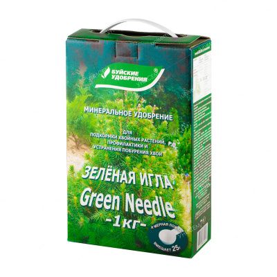 Буйские удобрения Зеленая игла – концентрированное минеральное удобрение. Применяется для корневой и внекорневой подкормки хвойных декоративных растений в целях профилактики и устранения побурения хвои. Препарат обеспечивает полноценное формирование молодых побегов, препятствует потере зеленого цвета хвои, придает красивый внешний вид растению, формирует устойчивость к неблагоприятным условиям окружающей среды.